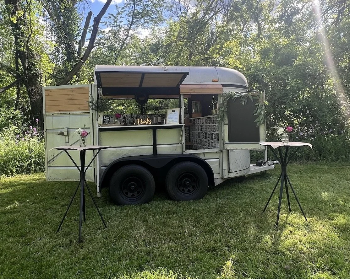 Your guests will love our vintage horse trailer that has been completely renovated into a boutique-style mobile event bar. Our Buggy Bar features a beautiful interior illuminated by a chandelier, quartz countertops, a 2-tap beer system and everything for a full bar service. Additionally, we provide 2 cocktail tables, a water station table that can be set up alongside the bar and an event message chalkboard. Let our bar elevate your event and create lasting memories for you and your guests!